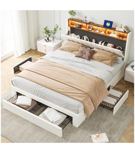 Cama de casal 140x200cm Bege Com 4 gavetas Com LED e USB Cabeceira de abrir