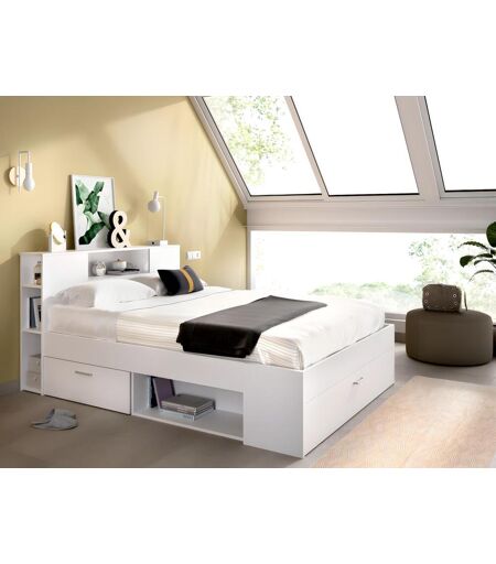 Vente-unique Cama com cabeceira de arrumação e gavetas disponível em Branco - 140x190cm - LEANDRE