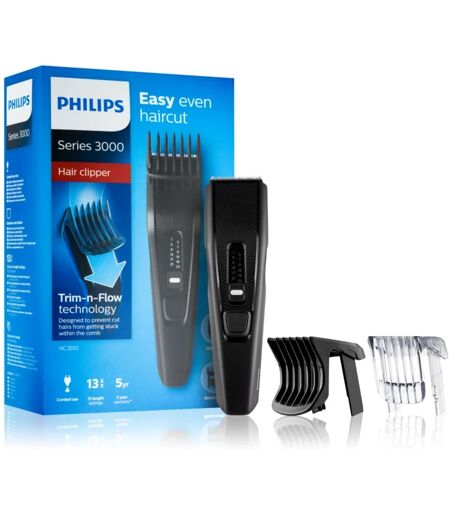Tecnologia Trim-n-Flow/Tecnologia DualCut/Lâminas em aço inoxidável/13 pos. bloqueio comprimento de corte/Pente ajustável para barba adicional/Utilização com fios eficiente/Pega confortável/Fácil de limpar/Manutenção zero/2 anos de garantia mundial Desempenho Cor do produto: Preto Número de medidas de comprimento: 13 Comprimento mínimo do cabelo: 0,5 mm Comprimento máximo do cabelo: 2,3 cm Largura da unidade de corte: 4,1 cm Lâmina auto-afiável: ✓ Material da lâmina: Aço inoxidável Lâmina removível: ✓ Ergonomia Pega(s): ✓ Pega ergonómica: ✓ Gestão de energia Fonte de alimentação: AC Recarregável: ✗ Voltagem de entrada AC: 100 - 240 V Outras características Sem necessidade de manutenção: ✗ Não necessita de lubrificação: ✓ Pesos e dimensões Largura: 70 mm Profundidade: 140 mm Altura: 224 mm Peso: 248 g Conteúdo da embalagem Pente de cabelo: ✓ Pentes anexados: Barba Bateria Bateria recarregável: ✓ ...