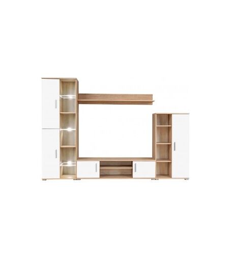 Este móvel de parede será um ótimo complemento para a sua sala, pois poderá aproveitar o espaço sem ter que deixar de lado o seu estilo. Este armário de parede é composto por dois armários laterais de diferentes tamanhos, um móvel de TV e uma estante, proporcionando-lhe um amplo espaço para guardar o seu equipamento multimédia, leitor de DVD, suportes multimédia, livros e todo o tipo de artigos mais pequenos. Será ideal para expor objetos decorativos, molduras ou até plantas. O armário esquerdo possui três prateleiras de vidro com luzes LED ecológicas para criar um ambiente aconchegante. Nosso armário é feito em compensado de excelente qualidade e possui puxadores metálicos, conferindo-lhe um visual moderno que combina com qualquer decoração. A montagem é muito simples. ...
