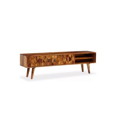 O nosso elegante e funcional móvel de TV em madeira será um complemento atraente para a sua casa. Este móvel é feito em madeira de sheesham maciça e também pode ser utilizado como armário baixo ou aparador. Sheesham é uma madeira tropical famosa por seus grãos ricos e também conhecida como jacarandá ou pau-rosa. Cada etapa do processo é realizada com o maior cuidado, seja polimento, pintura ou envernizamento. O trabalho artesanal e os belos grãos da madeira tornam cada peça de mobiliário única e ligeiramente diferente das restantes. Graças ao grande armário e às duas prateleiras, você pode armazenar facilmente seus dispositivos de mídia digital, console de jogos, mídia ou outros itens. Sua montagem é fácil. Nota importante: os grãos e as cores da madeira podem variar de peça para peça, tornando cada uma das nossas mesas únicas, a entrega é aleatória ...