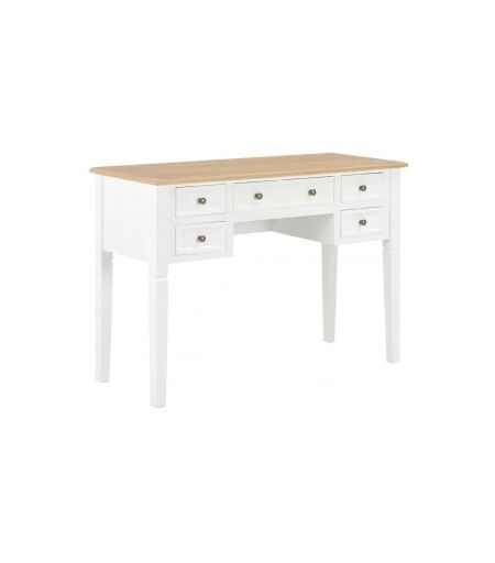 Esta secretária de madeira, com seu design simples e atemporal, dará um toque romântico ao seu estúdio ou quarto. Esta secretária durável apresenta cinco grandes gavetas, que proporcionam espaço suficiente para guardar e organizar seus arquivos, documentos e material de escritório. A secretária também oferece um amplo espaço para seus ornamentos ou outros pertences privados. Esta mesa robusta é feita de MDF e madeira de pinho de alta qualidade e tem um acabamento de pintura branca. ...