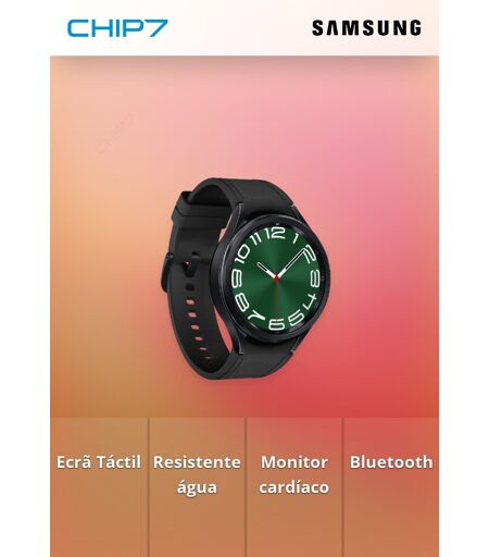 UM SMARTWATCH COM ASPETO CLÁSSICO O Galaxy Watch6 Classic herda o toque clássico dos relógios de toda a vida, com uma moldura rotativa e fabricado em aço inoxidável para maior resistência, tudo isso sem renunciar a todas as funcionalidades de desporto e de saúde. Além disso, a sua bracelete híbrida de pele confere-lhe maior versatilidade. O MAIOR ECRÃ DE SEMPRE NUM GALAXY WATCH Graças a uma redução das margens pretas, o ecrã útil do novo Galaxy Watch6 é 20% maior do que o seu antecessor e torna qual quer experiência mais interativa, imersiva e de fácil visualização. Para além disso, o ecrã é de Cristal de Safira, o que o torna mais resistente ao impacto. PERSONALIZAÇÃO SEM LIMITES O número de mostradores no Galaxy Watch6 é maior do que nunca, para além de mostradores clássicos, ou mostradores que apresentam a tua informação de exercício, adicionámos novos mostradores dinâmicos. Mudar as novas braceletes do Galaxy Watch6 é mais simples que nunca graças ao novo sistema One-Click. Carrega no botão para soltar a bracelete e pronto. Ah! E não te preocupes, podes continuar a usar outras braceletes universais. SAÚDE HOLÍSTICA Define zonas de frequência cardíaca personalizadas e recebe alertas quando está alta ou baixa. Usa o Galaxy Watch6 enquanto dorme para monitorizar o sono, com o Coaching do Sono, recebe dicas através do seu pulso. Conhece melhor o teu corpo, acompanha o teu desempenho em mais de 90 treinos diferentes ou cria um treino personalizado ativando a deteção automática em treinos selecionados. ECOSSISTEMA GALAXY Como tens podido comprovar, o Galaxy Watch6 é muito mais que um relógio desportivo. Sabes o que move tudo isto? O nosso processador mais potente num Galaxy Watch até à data e com a maior bateria para te dar até 21% mais de autonomia. ESPECIFICAÇÕES: Tamanho: 46,5x46,5x10,9mm 59Gr Ecrã: 1,47’’ (480x480) Materiais: Aço Inoxidável Processador e memória: Exynos W930 + 2GB de RAM + 16GB de Armazenamento Interno Bateria: 425mAh Carregamento: WPC Wireless Charging + Carreg. rápido Conectividade: BT 5.3 / WiFi 2,4Ghz & 5Ghz / GPS /NFC /LTE Sáude: Monitor de frequência cardíaca, ECG, Composição corporal (BIA), SpO2 + temperatura da pele Sensores: Acelerómetro, giroscópio, barómetro, luz ambiente, bússola ...