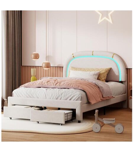 Cama de casal 140x200cm - estrutura de cama com 2 gavetas, estrado de ripas e cabeceira LED - em tecido de flanela bege
