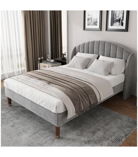 Cama de casal 160x200cm, cama de adulto forrada com estrado e cabeceira de ripas de madeira, cama de adolescente, cama de criança - em veludo cinza