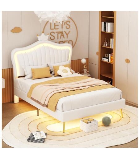 Cama de solteiro 90 x 200 cm - Cama em pele PU com lâmpadas LED e base de ripas e cabeceira de coroa (penteado) para adolescente - Branco