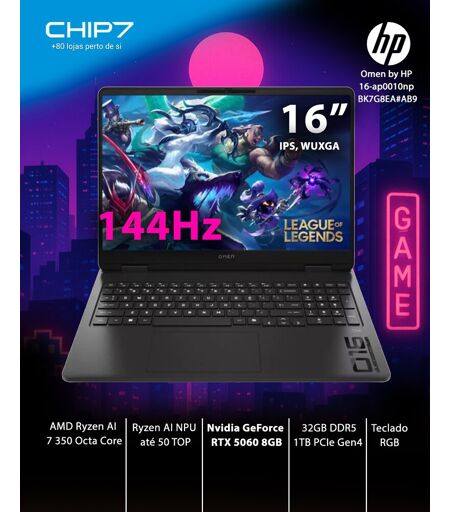 Portátil Omen by HP - AMD Ryzen AI 7 350 / NPU 50 TOPs / NVIDIA RTX 5060 8GB / 32GB DDR5 / 1 TB SSD / 16" IPS / WUXGA / 144HZ / S/ SO / Shadow Black - 16-ap0010np