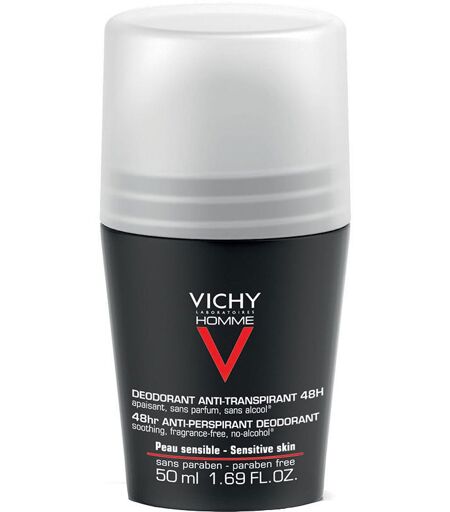VICHY HOMME deodorant anti-transpirant roll-on. Desodorizantes. Tipo de Pele: Sensível, Todo o tipo de pele. Formulação: Sem Parabens, Sem Álcool, Sem fragrância. Formato: Roll-on. Produto de Parafarmácia ...