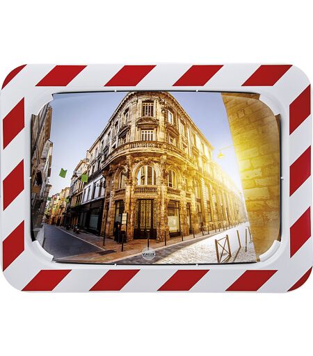 Espelho de trânsito Polymir®, retangular, AxL 800 x 1000 mm. Fornecimento = pré-montado, montagem final por parte do cliente. Altura = 800 mm. Largura = 1000 mm. Local de utilização = para o interior e exterior. Forma = retangular. Ângulo de visão = 90 °. Material do caixilho = polipropileno. Distância máx. de observação = 30 m. Peso = 11.4 kg. Tipo de produto = espelhos de trânsito. Espelho inquebrável Polymir®. Com faixas retrorrefletoras vermelhas. Suporte universal para montagem em parede e poste incluído. Os espelhos de trânsito Vialux® garantem um elevado nível de segurança no trânsito. Permitem uma melhor visibilidade em cruzamentos perigosos, bem como à saída da sua própria garagem e em parques de estacionamento. Inquebrável, indeformável e com proteção UV reforçada, garante uma excelente qualidade da superfície do espelho. Espelho com 2 direções de visualização para um campo de visão até 90°. Cada espelho é fornecido com um suporte universal em aço galvanizado a fogo. ...
