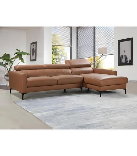 Sofá de canto direito em pele de búfalo e apoios de cabeça FLORENCE. Caramelo. Dimensões: C253xL173xA72/92cm. Pés de metal. Estrutura de madeira de eucalipto. ...