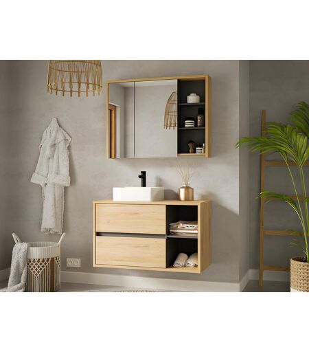 Móvel suspenso para colocar sob o lavatório para casa de banho - Cor: carvalho e detalhe debruado cinza - Espírito industrial e contemporâneo - 2 gavetas soft close e 2 nichos de arrumação - Lavatório simples - C100 x A45,5 cm - PURNAL ...