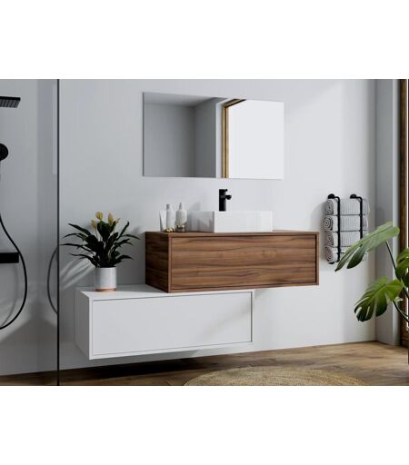 Vente-unique Móvel de casa de banho suspenso natural escuro e branco com lavatório individual e duas gavetas 94 cm - TEANA II