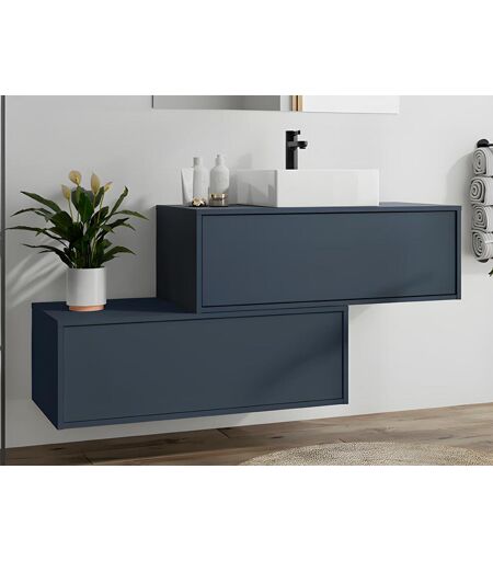 Móvel suspenso assimétrico de lavatório individual para casa de banho, cor azul-escuro, dimensões: C94 x L47 x A32 cm, lavatório de cerâmica branca de pousar, arrumação ampla com 2 gavetas empurrar/puxar, estilo contemporâneo, TEANA ...