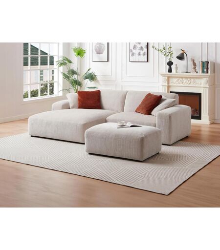 Sofá de canto esquerdo veludo canelado bege. Made for Design. 4 almofadas adicionais. Assento amplo e confortável. Pufe a condizer. C254 x L161 x A80 cm TIRONO da Maison Céphy ...