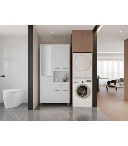 Coluna de casa de banho branca com espelho, dimensões: C88 x L30 x A180 cm, 1 nicho, 1 gaveta deslizante, 10 prateleiras e 5 portas de batente, puxadores cinza efeito metálico, fabrico europeu, estilo clássico intemporal, MINELA ...
