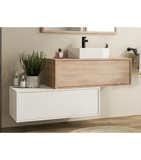 Vente-unique Móvel de casa de banho suspenso branco e natural claro com lavatório individual e duas gavetas 94 cm - TEANA II