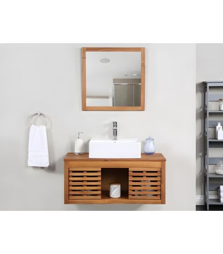 Vente-unique Móvel suspenso de casa de banho em madeira de acácia com lavatório individual e espelho de 90 cm - PENEBEL