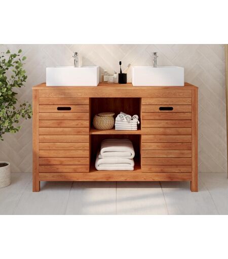 Móvel com lavatório duplo de pé para casa de banho - Natural claro - Madeira de acácia - Móvel casa de banho lavatório duplo de estilo balinês - 2 armários com puxadores e 2 nichos de arrumação - 2 lavatórios VERINA - C130 x A83 cm - PULUKAN ...