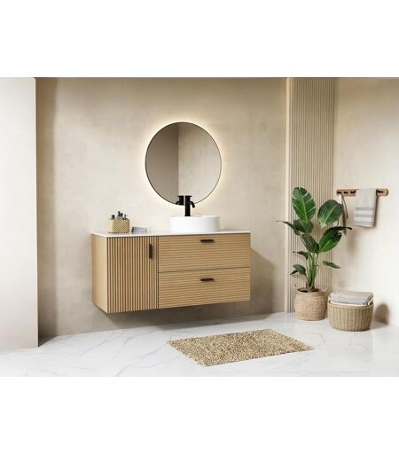 Vente-unique Móvel de casa de banho suspenso estriado com lavatório redondo – 1 porta e 2 gavetas – Natural claro – 120 cm – SARONE