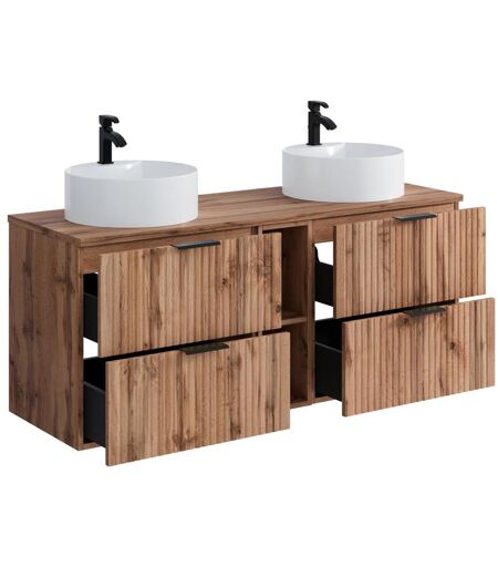 Vente-unique Móvel de casa de banho suspenso estriado com nichos e lavatório duplo de pousar redondo natural claro C140 cm - ZEVARA