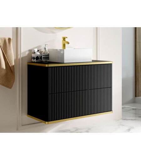 Vente-unique Móvel de casa de banho suspenso estriado rebordo dourado com lavatório de pousar preto 80 cm - KELIZA