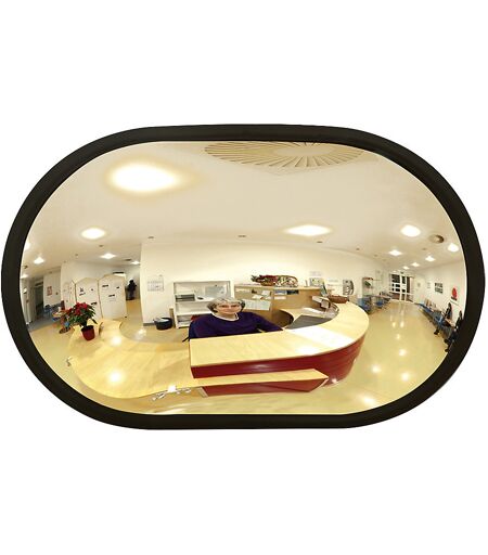 Espelho para interior em vidro acrílico, oval, AxLxP 260 x 360 x 75 mm. Fornecimento = montado. Altura = 260 mm. Largura = 360 mm. Profundidade = 75 mm. Local de utilização = para o interior. Forma = oval. Versão do caixilho = revestimento preto. Material do caixilho = silicone. Distância máx. de observação = 3 m. Peso = 0.6 kg. Tipo de produto = espelhos industriais. Campo de observação extremamente grande. Montagem simples na parede. Construção compacta. Espelho em vidro acrílico com rebordo preto. O abaulamento especial e pouco profundo do espelho permite o controlo visual de todo o espaço. Excelente reprodução da imagem, sem distorção , para uma maior distância de observação , por exemplo, para pavilhões de armazenamento, linhas de produção, estacionamentos e escritórios. Diâmetro 800/180 mm com orifícios de montagem pré-perfurados. ...