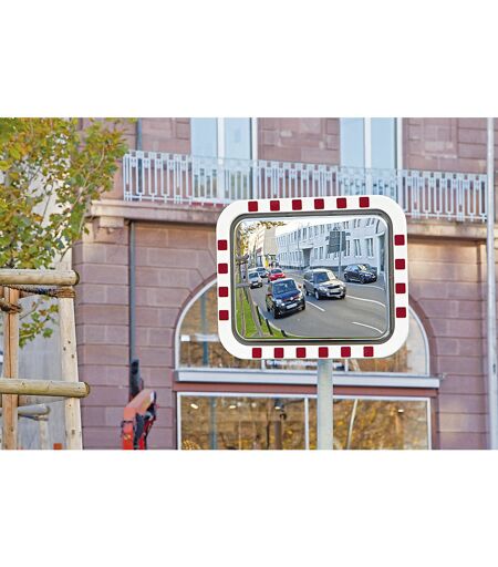 Espelho de trânsito ICE FREE, AxL 450 x 600 mm, sem gelo, a partir de 2 unid. Fornecimento = pré-montado, montagem final por parte do cliente. Altura = 450 mm. Largura = 600 mm. Local de utilização = para o interior e exterior. Forma = retangular. Versão do caixilho = vermelho-branco refletor. Material do caixilho = aço inoxidável. Resistência a temperaturas = até -20 °C. Distância máx. de observação = 6 m. Peso = 15 kg. Tipo de produto = espelhos de trânsito. Antiembaciamento e anticongelamento. Não necessita de alimentação elétrica. Capa do espelho em aço inoxidável. Espelho de trânsito antiembaciamento e anticongelamento com capa em aço inoxidável. Armação em plástico branco resistente às intempéries com tiras refletoras vermelhas . Especialmente adequado para locais sem fonte de alimentação ou com condições meteorológicas alternadas . Com almofada de gel termoativa comprovada. Esta regula a temperatura da superfície do espelho conforme a temperatura exterior. Assim, evita-se o embaciamento e o congelamento . Braçadeira universal para postes com Ø de 60 - 90 mm e fixação integrada para braçadeira de fita. ...
