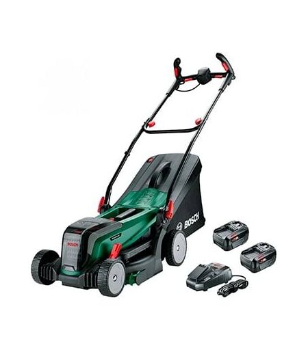 Corta-relvas UniversalRotak 2x18V-37-550 Bosch 06008B9E00 Corte de relva potente graças ao motor sem escovas e ao sistema de 36 V (2 baterias de 18 V) Relvados limpos graças ao saco de tecido para recolha de relva e do indicador de saco cheio integrado Ideal para cortar relvados de médias a grandes dimensões com relva comprida ou curta Desempenho potente de 36 V com 2 baterias de 18 V Syneon Te ...