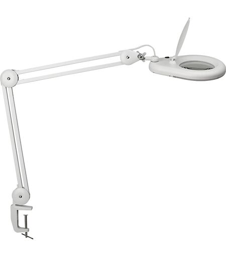 Candeeiro LED com lupa MAULviso IP54, comprimento do braço 410 mm, com mola de mesa, branco. Fornecimento = montado. Potência = 8 watt. Lâmpada = LED. Tensão de conexão = 220 - 240 V. Cor = branco. Material da armação = metal. Tipo de proteção = ficha europeia II. Consumo de energia = 8 kWh/1000h. Cabo de conexão = 1.7 m. Pé do candeeiro = com mola de mesa. Diâmetro da lente = 127 mm. Largura da cabeça do candeeiro = 200 mm. Cabeça do candeeiro = inclinável, rotativo. Vida útil = 50000 horas. Corrente para iluminação = 935 Lúmen. Profundidade da cabeça do candeeiro = 265 mm. Potência de iluminação máx. = 2120 lux. Peso = 2.56 kg. Cor da luz = branco luz do dia. Temperatura da cor = 6500 K. Comprimento do braço = 410 mm. Lente em vidro verdadeiro de 3 dioptrias (ampliação 1,75 vezes), Ø 5'' (12,7 cm), superfície da lente 144 cm². Utilidade dupla: lupa e candeeiro funcional para posto de trabalho. LED dispostos em círculo para iluminação uniforme. Inclui tampa de proteção que evita a incidência solar e a acumulação de pó na lente. Estável e sólido, regulação extremamente variável. Interruptor na cabeça do candeeiro para ligar e desligar confortavelmente. Sem consumo de energia no estado desligado. Consumo de energia extremamente baixo. Ideal para trabalhos de precisão em laboratórios, oficinas, escritórios técnicos e consultórios médicos. Em áreas privadas para filatelistas, mecânicos de precisão ou como lupa de leitura. Braço metálico robusto e forte em paralelograma, giratório em 360°. Cabeça do candeeiro CxL 265 x 200 mm, com 56 LED, 6500 Kelvin, intensidade luminosa de 2120 Lux a uma distância de 350 mm, feixe luminoso de 935 Lumen. Garra de aperto em metal revestido a plástico (largura de aperto até 63 mm). Comprimento do braço inferior e superior 410 mm. Altura em posição de trabalho normal 410 mm. Altura ajustável até 750 mm. Contém lâmpadas LED integradas. As lâmpadas não podem ser substituídas. ...