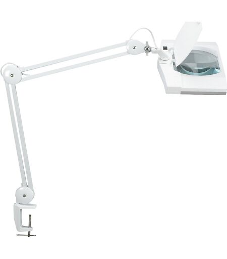 Candeeiro LED com lupa MAULvitrum, com garra de aperto, branco. Fornecimento = pré-montado, montagem final por parte do cliente. Potência = 8 watt. Lâmpada = LED. Tensão de conexão = 220 - 240 V. Cor = branco. Tipo de proteção = fonte de alimentação europeia II. Consumo de energia = 7 kWh/1000h. Cabo de conexão = 1.6 m. Pé do candeeiro = pé de aperto. Largura da cabeça do candeeiro = 300 mm. Cabeça do candeeiro = rotativo, inclinável. Vida útil = 20000 horas. Corrente para iluminação = 949 Lúmen. Profundidade da cabeça do candeeiro = 215 mm. Potência de iluminação máx. = 1830 lux. Peso = 3.48 kg. Cor da luz = branco luz do dia. Temperatura da cor = 6500 K. Comprimento do braço = 410 mm. Ideal para trabalhos precisos em laboratórios, oficinas, escritórios técnicos, consultórios médicos ou áreas privadas para filatelistas, mecânicos de precisão ou como lupa de leitura. LED dispostos em círculo para iluminação uniforme. Inclui tampa de proteção que evita a incidência solar e a acumulação de pó da lente. Utilidade dupla: lupa e candeeiro para posto de trabalho funcional. Estável e sólido, regulação extremamente variável. Zero consumo de energia no estado desligado. Braço metálico robusto em paralelograma, giratório em 360°. Comprimento do braço em baixo e em cima 410 mm. Altura na posição de trabalho normal: 420 mm. Lente especialmente grande, 307 cm², lente de 3 dioptrias (ampliação 1,75 vezes), 7,5'' x 6,2'' (195 x 157,5 mm). Cabeça do candeeiro aprox. 215 x 300 mm, giratória e inclinável. Interruptor na cabeça do candeeiro para ligar e desligar confortavelmente. Com 108 LED, 6500 Kelvin, luz diurna branca. Intensidade luminosa de 1830 Lux a uma distância de 35 cm, feixe luminoso útil por fonte de luz 949 Lumen. Garra de aperto em metal revestido a plástico (largura de aperto até 65 mm). Consumo de energia ponderado de 7 kWh/1000h. Vida útil dos LED: 20000 horas. Contém lâmpadas LED integradas. As lâmpadas não podem ser substituídas. ...