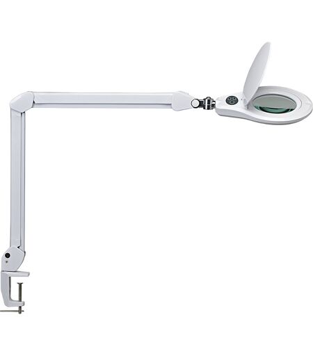 Candeeiro LED com lupa MAULsource, com possibilidade de regulação da intensidade, branco. Fornecimento = pré-montado, montagem final por parte do cliente. Potência = 8 watt. Lâmpada = LED. Tensão de conexão = 220 - 240 V. Cor = branco. Tipo de proteção = fonte de alimentação europeia II. Consumo de energia = 8 kWh/1000h. Cabo de conexão = 1.8 m. Pé do candeeiro = pé de apoio. Diâmetro da lente = 127 mm. Largura da cabeça do candeeiro = 200 mm. Cabeça do candeeiro = inclinável, rotativo, articulação 3 D. Característica = com possibilidade de regulação da intensidade. Vida útil = 20000 horas. Corrente para iluminação = 1070 Lúmen. Profundidade da cabeça do candeeiro = 225 mm. Potência de iluminação máx. = 2140 lux. Peso = 2.381 kg. Cor da luz = branco luz do dia. Temperatura da cor = 6500 K. Comprimento do braço = 390 / 440 mm. Ideal para trabalhos precisos em laboratórios, oficinas, escritórios técnicos, consultórios médicos ou áreas privadas para filatelistas, mecânicos de precisão ou como lupa de leitura. LED dispostos em círculo para iluminação uniforme. Inclui tampa de proteção que evita a incidência solar e a acumulação de pó da lente. Utilidade dupla: lupa e candeeiro para posto de trabalho funcional. Braço metálico robusto em paralelograma, revestido de forma elegante, giratório em 360°. Comprimento do braço em baixo 390 mm, em cima 440 mm, altura na posição de trabalho normal: 390 mm. Lente grande, 126 cm², lente de 3 dioptrias (ampliação 1,75 vezes), Ø 5'' (12,7 cm). Com 60 LED, 6500 Kelvin, luz diurna branca, regulação progressiva da luminosidade. Intensidade luminosa de 2140 Lux a uma distância de 35 cm, feixe luminoso útil por fonte de luz 1070 Lumen. Cabeça do candeeiro aprox. 200 x 255 mm, giratória e inclinável. Cabeça do candeeiro ajustável em três dimensões. Interruptor na cabeça do candeeiro para ligar e desligar confortavelmente. Garra de aperto em metal revestido a plástico (largura de aperto até 63 mm). Consumo de energia ponderado de 8 kWh/1000h. Vida útil dos LED: 20000 horas. Contém lâmpadas LED integradas. As lâmpadas não podem ser substituídas. ...