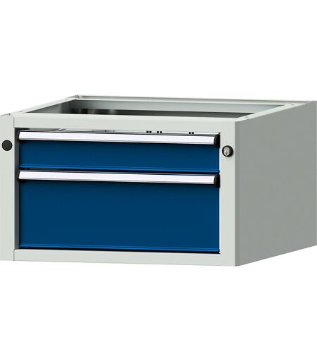 Armário inferior para mesas de trabalho com regulação em altura elétrica LIFT, LxP 570 x 615 mm, altura 330 mm, 2 gavetas. Fornecimento = montado. Altura = 330 mm. Largura = 570 mm. Profundidade = 615 mm. Número de gavetas = 2 unid. Altura das gavetas = 90 / 180 mm. Capacidade de carga por gaveta = 100 kg. Extração das gavetas = extração total. Guia das gavetas = extração de diferencial. Tipo de fecho = fecho central (cilindro de substituição). Cor do corpo = cinzento claro RAL 7035. Cor da frente = azul genciana RAL 5010. Dimensões interiores das gavetas = 410x540 mm. Espaço de arrumação adicional. Elevada capacidade de carga: 100 kg por gaveta. Extração total 100% - aproveitamento 100%. Puxador em alumínio com possibilidade de inscrição. O armário inferior é uma opção de ampliação adequada para, por exemplo, mesas de trabalho da série LIFT. O armário inferior pode ser aparafusado simplesmente por baixo do respetivo tampo de trabalho (espessura mín. 40 mm). Dimensão interior da gaveta largura x profundidade 410 x 540 mm, capacidade de carga da gaveta 100 kg com a carga distribuído de modo uniforme, extração total com bloqueio de extração individual. Fecho central e 2 chaves (cilindro de substituição DOM). Construção em aço resistente pintada a pó em cinzento claro RAL 7035/azul genciana RAL 5010. ...