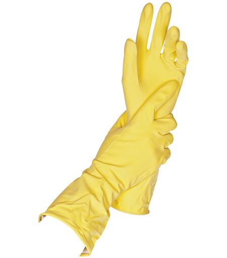 Luvas universais, látex, amarelo, embalagem de 144 pares, tamanho 7 (S). Fornecimento = montado. Parte superior = látex. Tamanho = S. Cor = amarelo. Norma = CAT I. Campo de aplicação = oficina, indústria alimentar, setor da limpeza, área sanitária. Tipo de produto = luvas descartáveis. Espessura de parede extra grossa: 0,45 mm. Cano longo para proteção para além do pulso. Látex de alta qualidade - extremamente resistente à rutura e reutilizável. Boa aderência graças ao perfil alveolar na palma da mão e nas pontas dos dedos. Próprias para alimentos. Rebordo enrolado - capta pingos com as mãos levantadas. Luvas universais para uso doméstico. Como luvas de limpeza de alta qualidade, protege de forma fiável as suas mãos da humidade, agentes de limpeza e soluções alcalinas. Certificadas para o manuseamento de alimentos e são muito confortáveis de usar graças à flocagem no interior. O elevado teor de látex assegura uma elasticidade excecional e uma extrema resistência ao rasgo. As luvas são adequadas para muitas aplicações diferentes na indústria, cantina, laboratório ou limpeza. ...