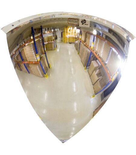 Espelho panorâmico, ângulo de visão 90°, Ø 800 mm. Fornecimento = montado. Altura = 800 mm. Largura = 800 mm. Local de utilização = para o interior. Forma = oitavo de esfera. Ângulo de visão = 90 °. Diâmetro = 800 mm. Distância máx. de observação = 20 m. Distância mín. de observação = 15 m. Peso = 0.7 kg. Tipo de produto = espelhos panorâmicos. Solução eficiente para áreas com pouca visibilidade. Maior segurança em espaços mais apertados. Certificação TÜV e GS. O espelho de cúpula é uma solução eficiente e compacta para melhorar a segurança no trabalho. Com a sua imagem espelhada brilhante, é ideal para utilização na indústria, em oficinas e armazéns. Graças ao seu ângulo de visão, este espelho panorâmico proporciona uma excelente panorâmica e ajuda a aumentar a segurança no local de trabalho. No comércio, funciona também como um dissuasor para potenciais ladrões. O espelho é certificado pela TÜV, o que confirma a sua elevada qualidade e segurança. O espelho pode ser aparafusado diretamente à parede ou ao teto (os orifícios são pré-perfurados no rebordo do espelho). 2 anos de garantia. ...