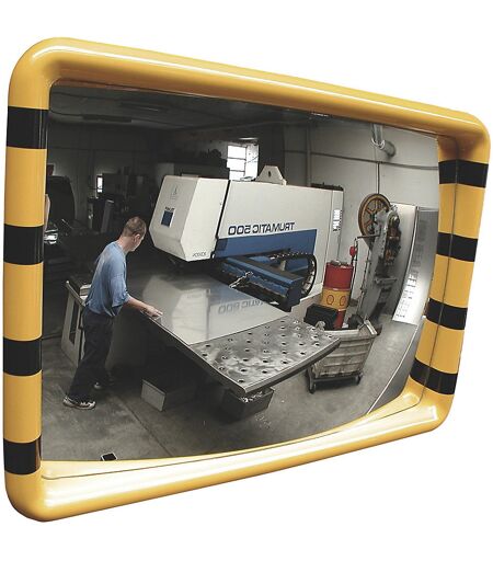 Espelho de supervisionamento, armação com tiras de aviso amarelas/pretas, LxA 900 x 600 mm. Fornecimento = montado. Altura = 600 mm. Largura = 900 mm. Local de utilização = para o interior. Forma = retangular. Versão do caixilho = com marcação de aviso em amarelo/preto. Material do caixilho = poliestireno. Distância máx. de observação = 25 m. Distância mín. de observação = 12 m. Peso = 8 kg. Tipo de produto = espelhos industriais. Para utilização nos locais de produção, empresas industriais e armazéns. Vidro acrílico antichoque. Pré-tratamento antiestático. Utilizável em formato vertical e horizontal. Com suporte de parede. O abaulamento reduzido da superfície do espelho possibilita uma excelente reprodução da imagem. Armação em poliestireno com tiras de aviso amarelas/pretas segundo a VBG 125, BGV A 8. Os dados para a distância em relação ao observador são valores de orientação recomendados. ...