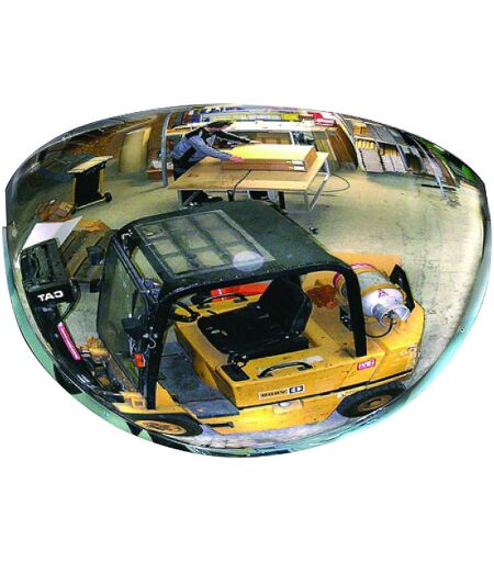 Espelho panorâmico, ângulo de visão 180°, Ø 600 mm. Fornecimento = montado. Altura = 600 mm. Largura = 600 mm. Local de utilização = para o interior. Forma = quarto de esfera. Ângulo de visão = 180 °. Diâmetro = 600 mm. Distância máx. de observação = 15 m. Distância mín. de observação = 10 m. Peso = 0.6 kg. Tipo de produto = espelhos panorâmicos. Solução eficiente para áreas com pouca visibilidade. Maior segurança em espaços mais apertados. Certificação TÜV e GS. O espelho de cúpula é uma solução eficiente e compacta para melhorar a segurança no trabalho. Com a sua imagem espelhada brilhante, é ideal para utilização na indústria, em oficinas e armazéns. Graças ao seu ângulo de visão, este espelho panorâmico proporciona uma excelente panorâmica e ajuda a aumentar a segurança no local de trabalho. No comércio, funciona também como um dissuasor para potenciais ladrões. O espelho é certificado pela TÜV, o que confirma a sua elevada qualidade e segurança. O espelho pode ser aparafusado diretamente à parede ou ao teto (os orifícios são pré-perfurados no rebordo do espelho). 2 anos de garantia. ...