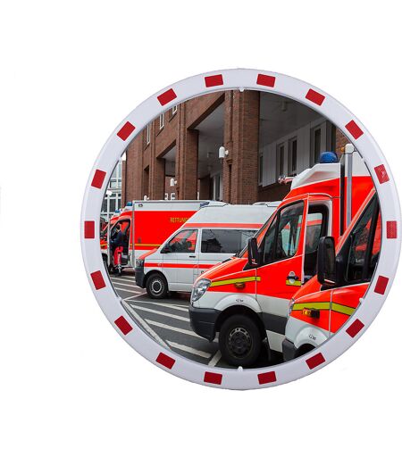 Espelho para trânsito com suporte universal, redondo, Ø 800 mm. Fornecimento = desmontado em peças. Altura = 800 mm. Largura = 800 mm. Profundidade = 50 mm. Local de utilização = para o interior e exterior. Forma = redondo. Ângulo de visão = 110 °. Versão do caixilho = vermelho-branco refletor. Material do caixilho = poliestireno. Diâmetro = 800 mm. Resistência a temperaturas = até +60 °C. Distância máx. de observação = 22 m. Distância mín. de observação = 15 m. Comprimento do braço de parede = 140 mm. Peso = 5.2 kg. Versão = com suporte universal para montagem na parede e no poste. Tipo de produto = espelhos de trânsito. Imagem refletida brilhante para uma representação clara. Suporte universal para montagem na parede e nos postes (50 - 85 mm). Armação notável. Descubra o espelho para trânsito com suporte universal - a solução perfeita para uma maior segurança no tráfego rodoviário e nas instalações da empresa. Este espelho de segurança de alta qualidade oferece uma imagem refletida brilhante com uma representação clara e, graças ao seu suporte universal, pode ser utilizado de forma flexível em suportes para montagem em parede e poste (50 - 85 mm). A apelativa armação vermelha e branca com refletores resistentes aos raios UV (tipo RA2) garante a máxima visibilidade e segurança. A superfície do espelho em PMMA robusto é resistente às intempéries e duradoura. A instalação simples permite uma utilização rápida e descomplicada. Ideal para proporcionar segurança em estradas, caminhos e acessos encobertos. ...