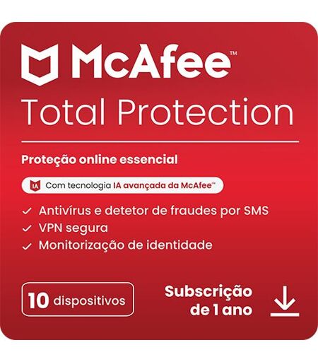 McAfee Total Protection (Windows, macOS, Android, iOS, ChromeOS) - 10 Dispositivos - Subscrição de 1 ano (Cartão de Chave de Produto ou Transferência Digital)