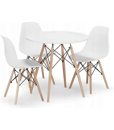 Mesa redonda branca Valora KOVA Ø80 com pernas de faia + 3 cadeiras OSAKA