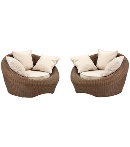 Renda-se ao design de linhas redondas do mobiliário de jardim WHITEHEAVEN com almofadas castanho! C107 x P101 x A66,5 cmAlumínio coberto com resina entrançada redondo Assento poliésterCastanho para a estrutura, creme para o assento e para as almofadas ...
