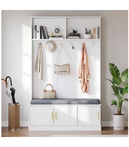 Características do produto: Design completo: Este cabideiro combina um gancho compacto, um banco e uma sapateira. Oferece organização ideal para todos os seus acessórios essenciais ao sair de casa. Armazenamento prático: 6 ganchos resistentes para casacos e chaves, um banco integrado com compartimento para sapatos e uma prateleira aberta para bolsas: tudo sempre ao alcance. Design moderno: Graças à tecnologia de gravação a laser linear e às frentes monocromáticas, este produto combina fluidez e elegância atemporal: um verdadeiro clássico. Materiais de alta qualidade: Feito de MDF e aglomerado duráveis, garante estabilidade ideal para anos de uso. Fácil montagem: Graças às peças pré-selecionadas e às instruções ilustradas, a montagem é brincadeira de criança. Dimensões: L 120 / P 40 / A 191 cm Material: Aglomerado Peso Líquido/Bruto: 43,95 kg/48,85 kg Capacidade de Carga da Bandeja: 50 kg/110 lb Capacidade de Carga da Gaveta: 20 kg/44 lb Quantidade por Pacote: 2. Se houver vários pacotes, eles não serão entregues no mesmo dia. Se você não receber o pacote completo em até três dias após o recebimento do primeiro, entre em contato conosco.Características Cor (nuance): Branco Material: Painéis e derivados de madeira Tipo de instalação: Para pousar Requer montagemDimensões Comprimento: 120 cm Altura: 191 cm Profundidade: 40 cm ...