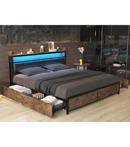 Merax Cama estofada com cabeceira - 160 x 200 cm - 4 gavetas - LEDs - base de ripas - cores marrom e preto