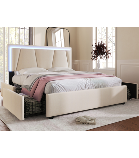 Merax Cama com iluminação LED e 4 gavetas - 160 x 200 cm - tecido de linho - base de ripas - bege