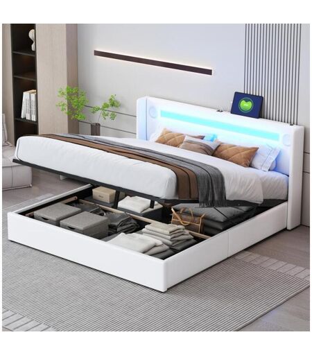 Merax Cama de arrumação 160 x 200 cm com cabeceira - LEDs, leitor Bluetooth e tomada USB - Pele PU - Branco