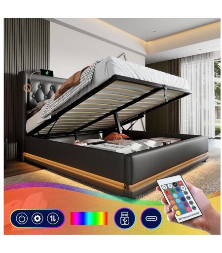 Merax Cama de armazenamento 140 x 200 cm com cabeceira - Tomadas USB e Tipo C - LEDs - Couro PU - Preto (sem colchão)
