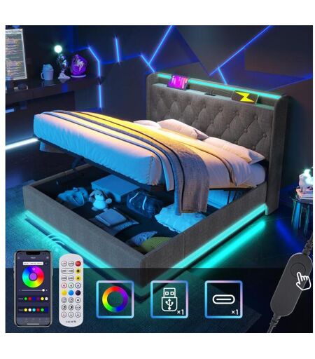 Merax Cama de arrumação 160 x 200 cm com cabeceira de arrumação - Tomadas USB e LED - Tecido de linho - Padrão de botões - Cinzento (sem colchão)