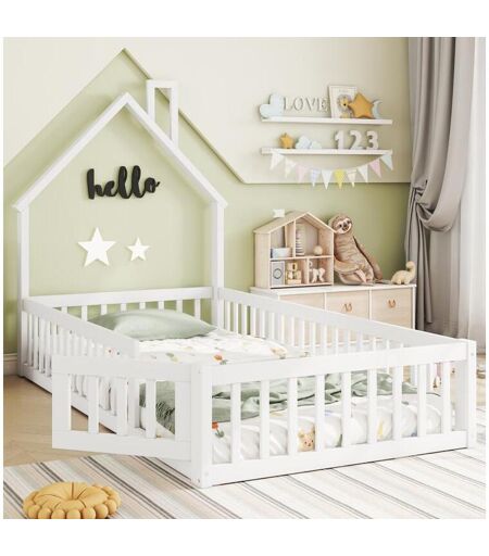 Merax Cama infantil 90 x 200 cm em madeira de pinho com grades e porta de proteção, base de ripas incluída, branca