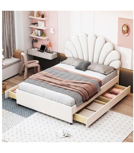 Merax Cama estofada em veludo 140 x 200 cm com 4 gavetas - cabeceira em forma de flor - bege