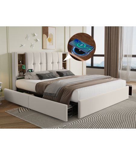 Merax Cama de casal 160 x 200 cm com carregamento sem fio USB C e 4 gavetas - veludo - bege