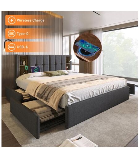 Merax Cama de casal 160 x 200 cm com carregamento sem fio USB C e 4 gavetas - veludo - cinza